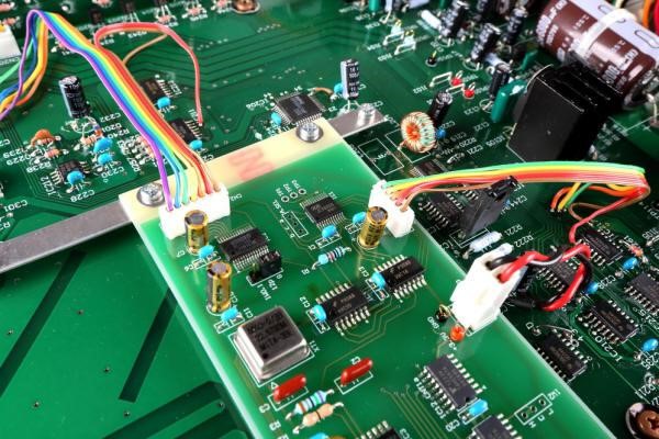 Печатная плата с электронными компонентами занимает все дно блока. Практически все, что мы можем здесь увидеть, было непосредственно заимствовано из предыдущей версии. Но можно увидеть также и изменение - и оно кардинально важное. До обработки, сигнал сперва попадает на цифровой приемник - прославленный чип Yamaha YM3436D, высоко ценимый производителями за свой низкий джиттер и хорошее подавление шумов. Чип принимает сигналы с длиной кодового слова до 24 бит, но его частота дискретизации ограничена 48kHz. Приемник изолирован от входа трансформаторами, согласующими импеданс. В предыдущей версии сигнал затем подавался на чип K2 JCV8009, установленный на плату справа от приемника, который отвечал за интерполяцию сигнала, конверсию из 16 бит в 24 бита и апсемплинг до 88.2 кГц. Теперь все по-другому. В центре основной печатной платы, в специально выделенном для этого месте, установлена еще одна печатная плата с логическими микросхемами. На входе мы видим все тот же чип K2 JCV8009 (тот, что расположен на основной печатной плате видимо больше не используется) окруженный восемью воротами CMOS, представляющими собой, как я предполагаю, часть схемы апсемплинга и цифровой фильтрации. Использовавшийся до этого цифровой фильтр NPC, по-видимому, отключен. Плата включает в себя также превосходный задающий мастер-генератор, гораздо лучший, чем тот, что использовался до этого, и усовершенствованный источник питания. Перед тем, как покинуть плату сигнал попадает на цифровой фильтр – еще одну великолепную микросхему почтенного возраста: Burr-Brown DF1706. Она известна тем, что использовалась с цифро-аналоговыми преобразователями Burr Brown PCM1704 D/A (давно снятыми с производства) . Мы можем увидеть их на основной печатной плате, на выходе, и что важно, они обединены в пары. Окружены они превосходными конденсаторами Sanyo (пурпурного цвета), используемыми также в моем Lektor AIR. Преобразование ток/напряжение (I/U) производится микросхемой OPA627 BB, фильтрами низких частот и каскадом усиления, выполненном на стандартных операционных усилителях JRC 5534. Присутствуют два болших полипропиленовых конденсатора, но они не включены в тракт передачи сигнала. Секция с чипами ЦАП изолирована от схемы K2 с помощью оптоэлектронных компонентов. Выходные коннекторы не имеют золотого покрытия.